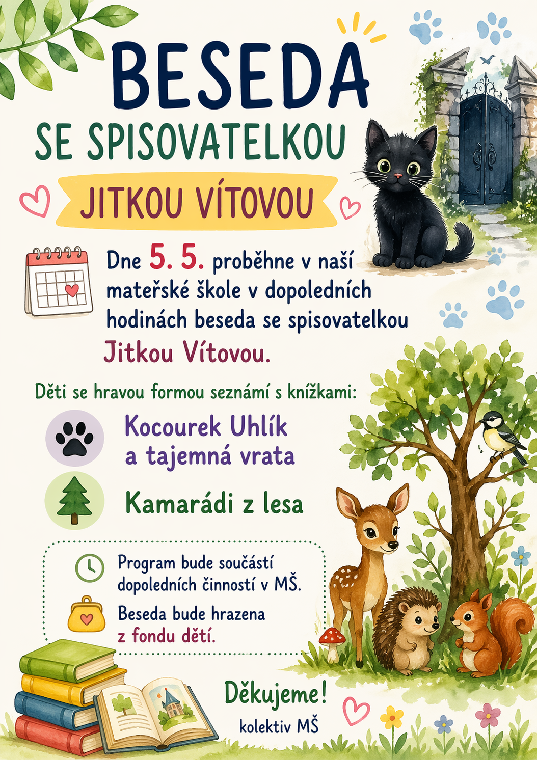 5. 5. 2026 Beseda se spisovatelkou Dne 5. 5. 2026 proběhne v naší mateřské škole v dopoledních hodinách beseda se spisovatelkou Jitkou Vítovou. Beseda bude hrazena z fondu dětí. Těšíme se na milé setkání s paní spisovatelkou.