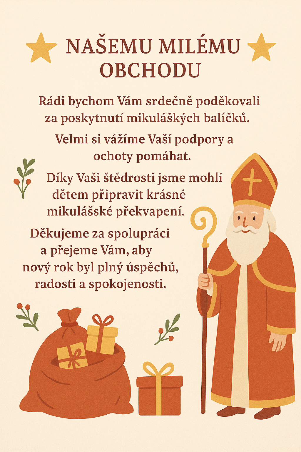 9. 12. 2025 🌟 Poděkování našemu milému obchodu 🌟 Děkujeme za poskytnutí mikulášských balíčků. Vaše štědrost nám umožnila připravit dětem krásné překvapení. Přejeme Vám úspěšný, radostný a spokojený nový rok!