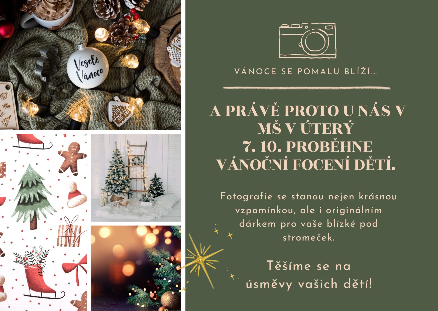 7. 10. 2025 🎄✨ Vánoce se pomalu blíží... ✨🎄 A právě proto u nás v MŠ v úterý 7. 10. proběhne vánoční focení dětí. 📸Fotografie se stanou nejen krásnou vzpomínkou, ale i originálním dárkem pro vaše blízké pod stromeček. Těšíme se na úsměvy vašich dětí!